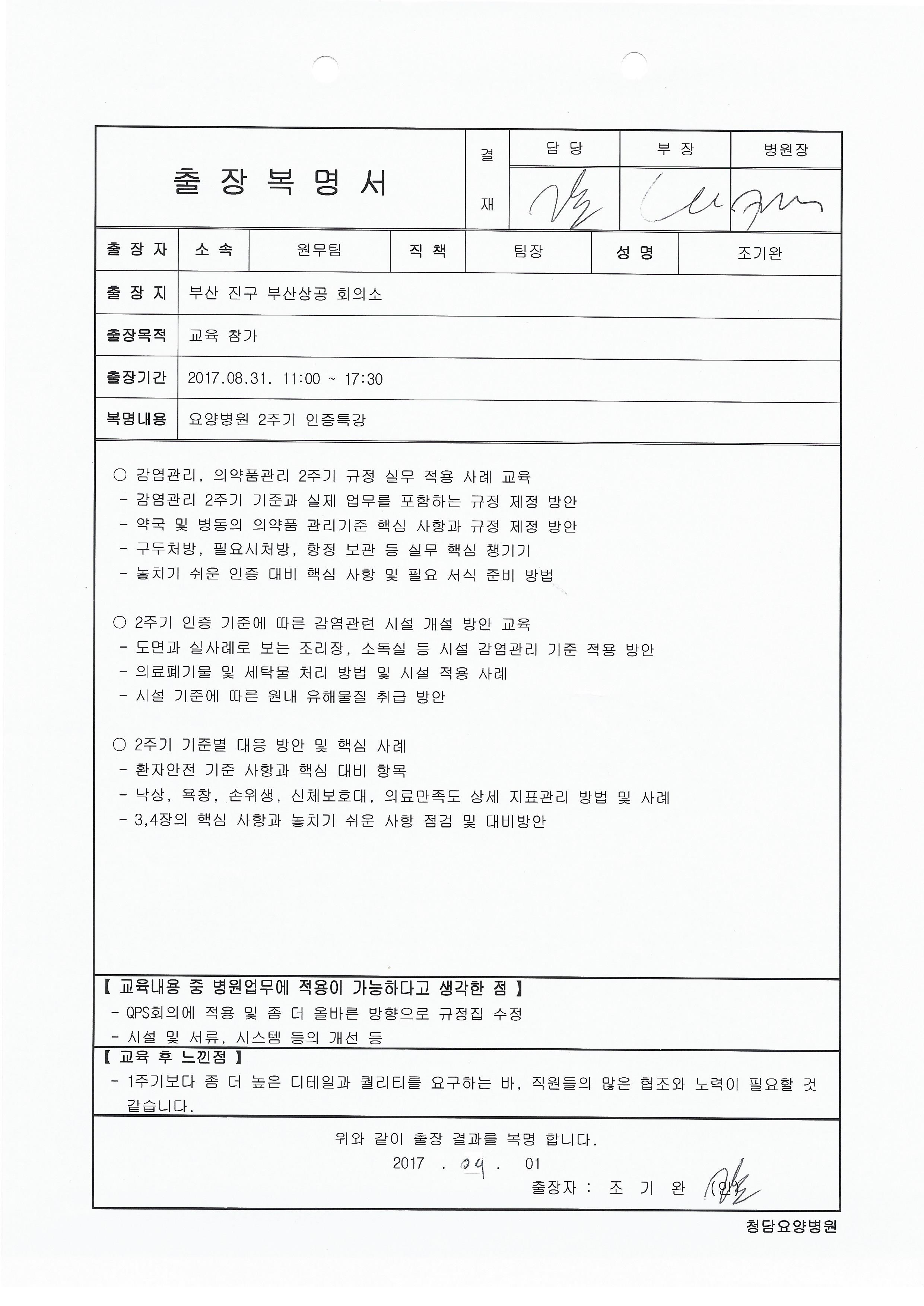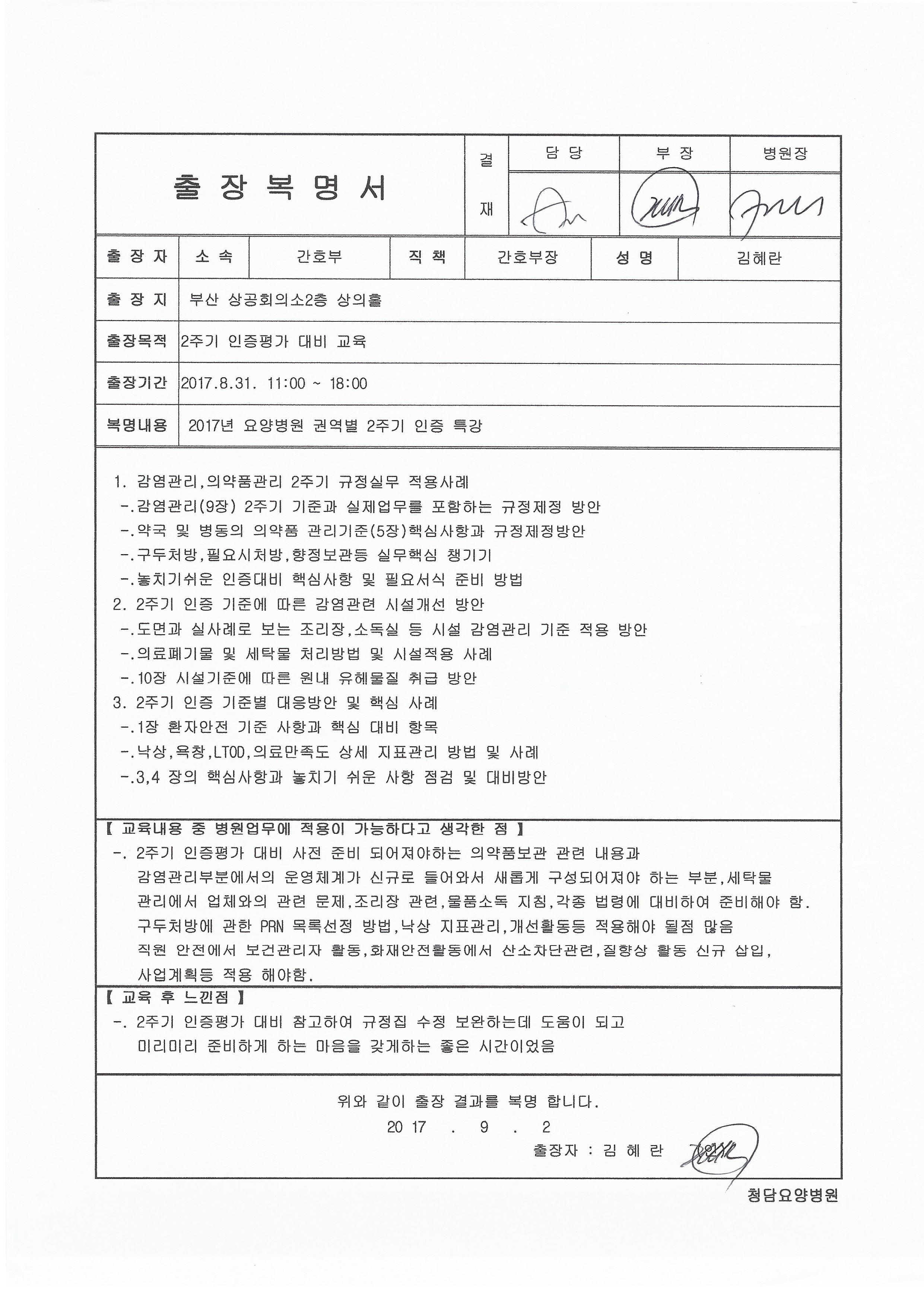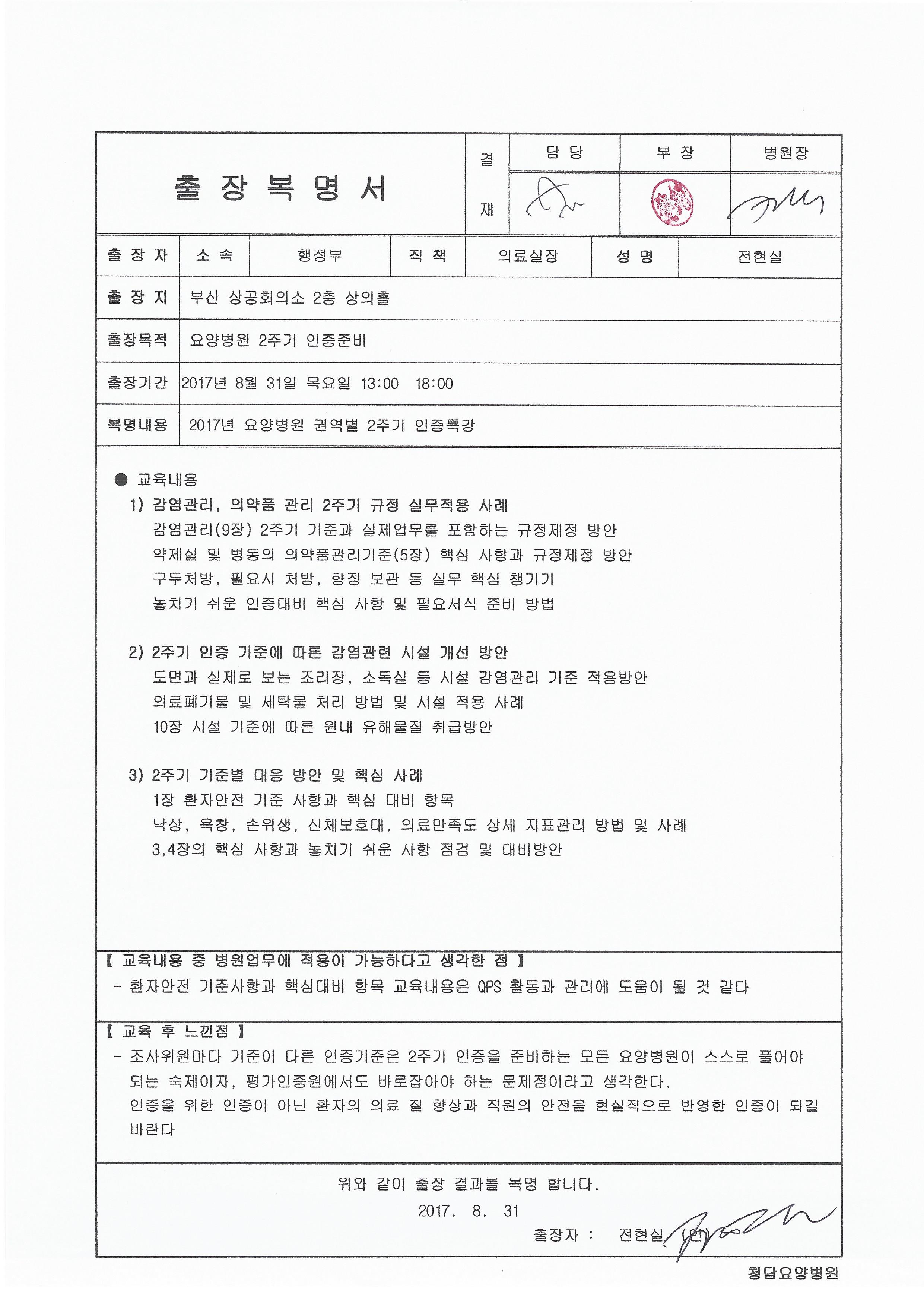 -. ±³À°ÀϽà : 2017. 8. 31 13½Ã~18½Ã -. ±³À°Àå¼Ò : ºÎ»ê»ó°øÈ¸ÀÇ¼Ò -. Âü ¼® ÀÚ : °£È£ºÎÀå, ÇàÁ¤ºÎÀå, ÀÇ·á½ÇÀå, Ãѹ«ÆÀÀå, ¿ø¹«ÆÀÀå