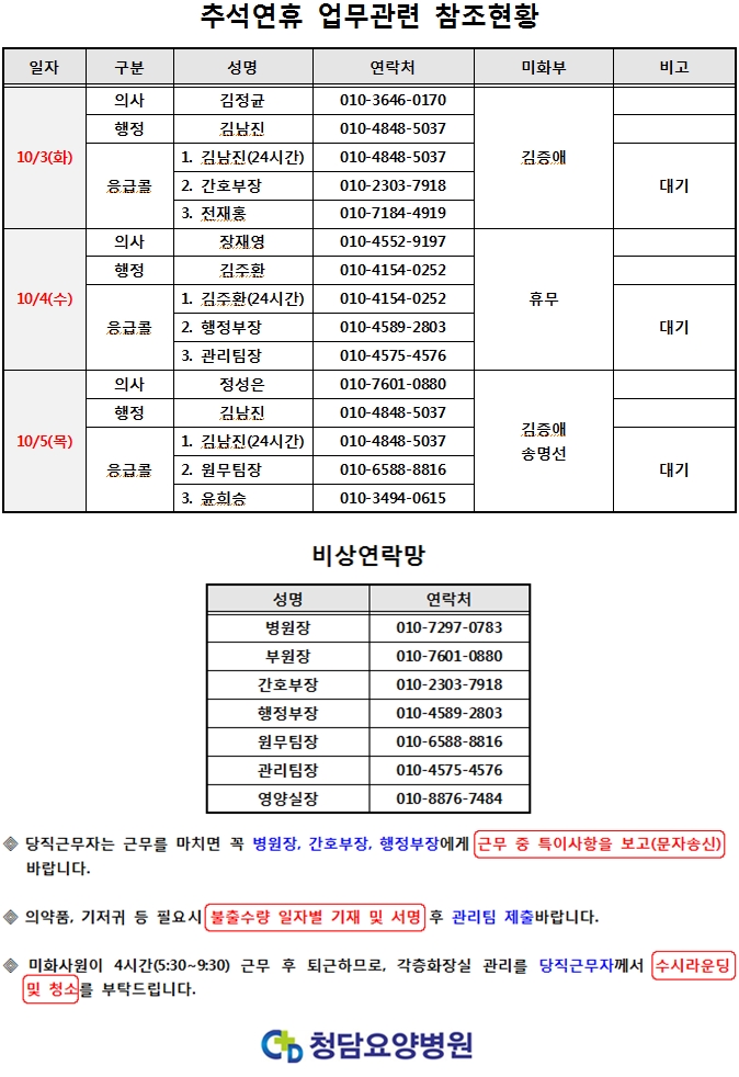 Ãß¼® ¿¬ÈޱⰣ 10¿ù 3ÀÏ(È­)~10¿ù 5ÀÏ(±Ý) º´¿ø ºñ»ó¿¬¶ô¸ÁÀÔ´Ï´Ù.