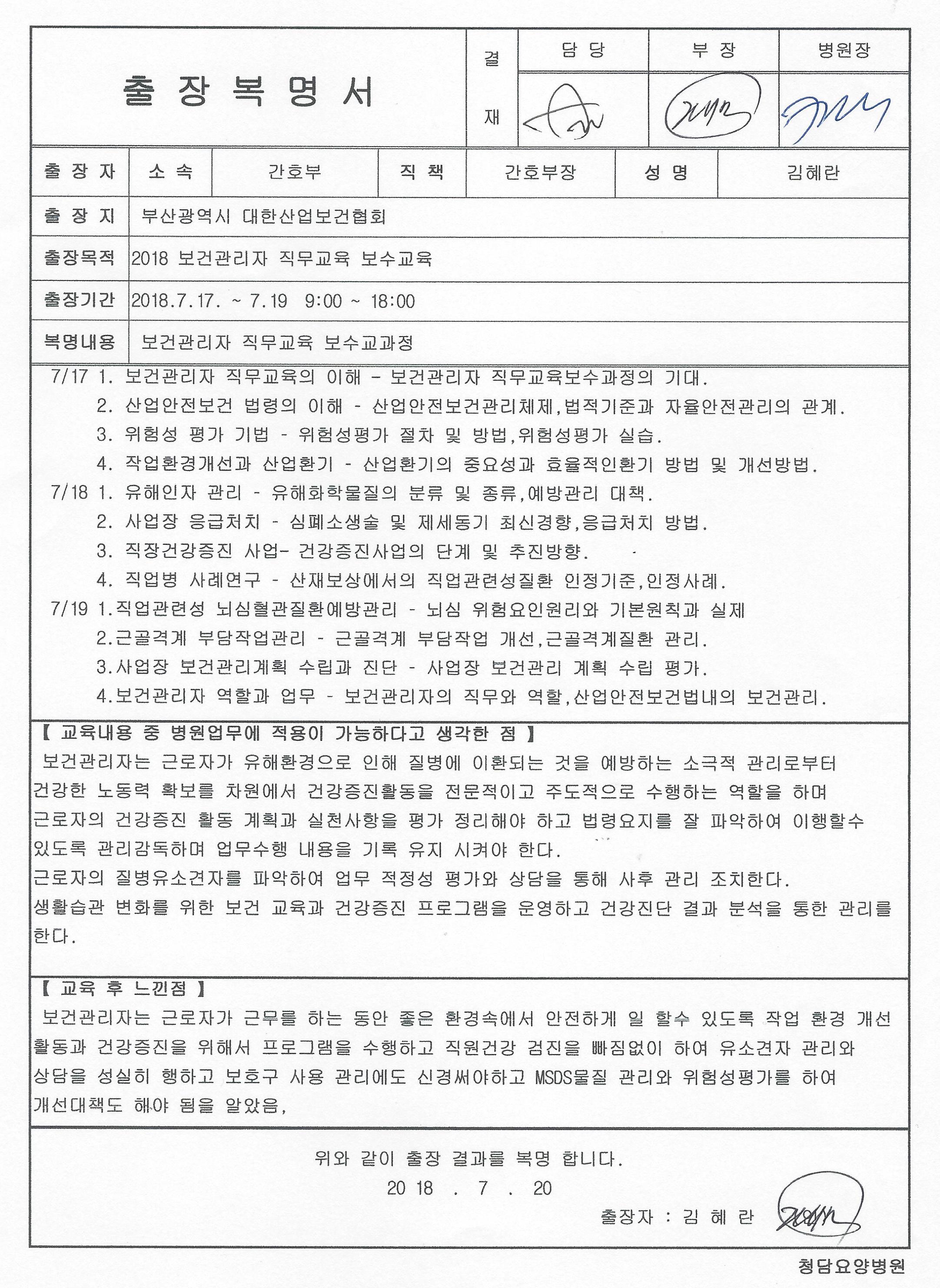 -. ±³À°ÀϽà : 2018.7.17(È)~7.19(¸ñ) 09:30~18:00 -. ±³À°Àå¼Ò : ºÎ»ê±¤¿ª½Ã ´ëÇÑ»ê¾÷º¸°ÇÇùȸ -. Âü ¼® ÀÚ : ±èÇý¶õ_°£È£ºÎÀå