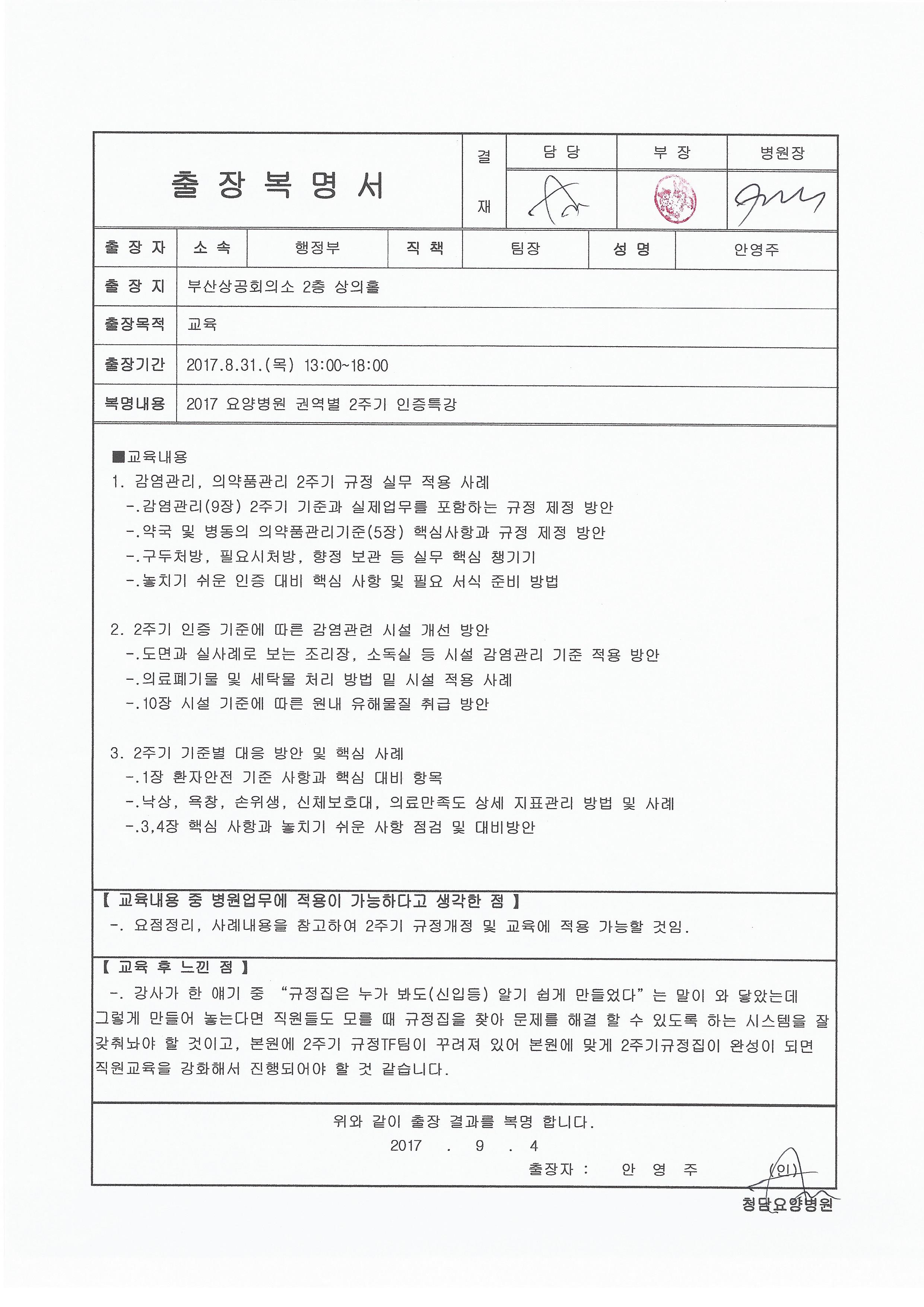 -. ±³À°ÀϽà : 2017. 8. 31 13½Ã~18½Ã -. ±³À°Àå¼Ò : ºÎ»ê»ó°øÈ¸ÀÇ¼Ò -. Âü ¼® ÀÚ : °£È£ºÎÀå, ÇàÁ¤ºÎÀå, ÀÇ·á½ÇÀå, Ãѹ«ÆÀÀå, ¿ø¹«ÆÀÀå