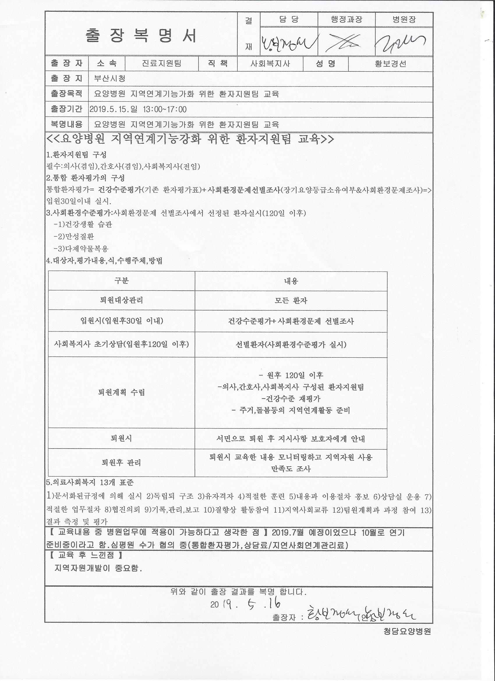 -. ±³À°ÀϽà : 2019. 05. 15(¼ö) 13:00~17:00 -. ±³À°Àå¼Ò : ºÎ»ê½Ãû -. Âü ¼® ÀÚ : Á¶°æ·¡(º´¿øÀå), ÇÏÁö¿ø(½É»ç°úÀå), Ȳº¸°æ¼±(»çȸº¹Áö»ç)